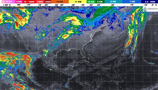 El pronóstico para la Península de Yucatán es de cielo despejado en la mañana, ambiente cálido durante el día, incremento de nubosidad en la tarde y viento del noreste de 15 a 30 km/h.