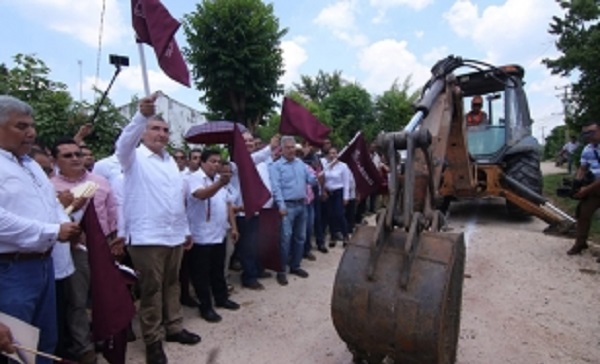 En una intensa gira que realizó este lunes por la cabecera municipal y la villa Benito Juárez (San Carlos), el mandatario entregó y supervisó obras sociales por más de 38.7 millones de pesos, en beneficio de más de 35 mil macuspanenses, que incluyen pavimentación de calles, tanques para almacenamiento de agua, construcción de pozos profundos y drenaje sanitario.