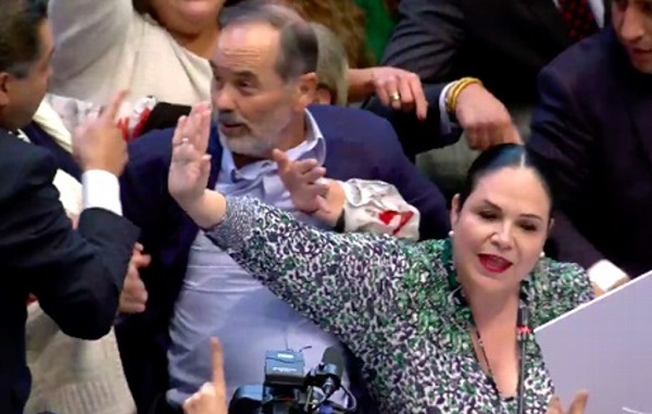 Cuando Piedra Ibarra se acercaba a tribuna, Madero intentó colocarse a un lado de la presidenta de la Mesa Directiva, Mónica Fernández; otros legisladores morenistas como Martha Guerrero y Citlalli Hernández se plantaron frente a él, lo que obligó a moverse detrás del asiento de la presidencia