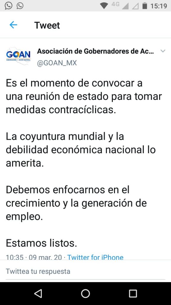 Ciudad de México a 09 de marzo de 2020.- La Asociación de Gobernadores del Partido Acción Nacional (PAN) llamó a realizar una reunión de Estado, con el fin de tomar las acciones pertinentes para el crecimiento de la economía mexicana.