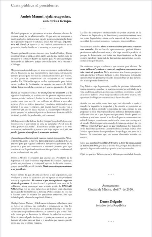 Verácruz, Verácruz a 07 de abril de 2020.- El senador de Movimiento Ciudadano Dante Delgado Rannauro, envió una carta al presidente Andrés Manuel López Obrador en donde le pide que cumpla con su obligación como presidente, que convoque a un acuerdo de unidad nacional y apoye a todos los sectores productivos del país.