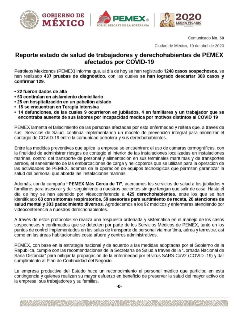 Ciudad de México va 19 de abril de 2020.- La empresa Petróleos Mexicanos dio a conocer que este día se presentaron