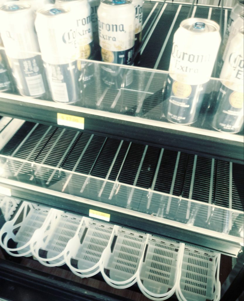Cancún, Quintana Roo a 22 de abril de 2020.- Algunos establecimientos dedicados cadenas comerciales se constató también como los anaqueles y refrigeradores están prácticamente vacíos, otros mantienen la venta de licores que también está teniendo fuerte demanda.