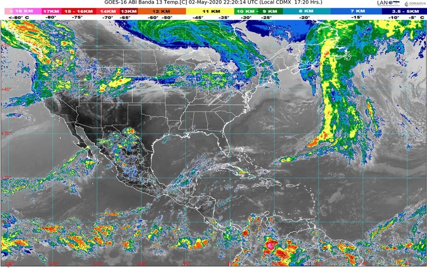 Canales de baja presión asociados con divergencia en la atmósfera superior originarán nubosidad densa y lluvias con descargas eléctricas, granizadas y fuertes vientos en el noroeste, oriente y sureste del territorio nacional.