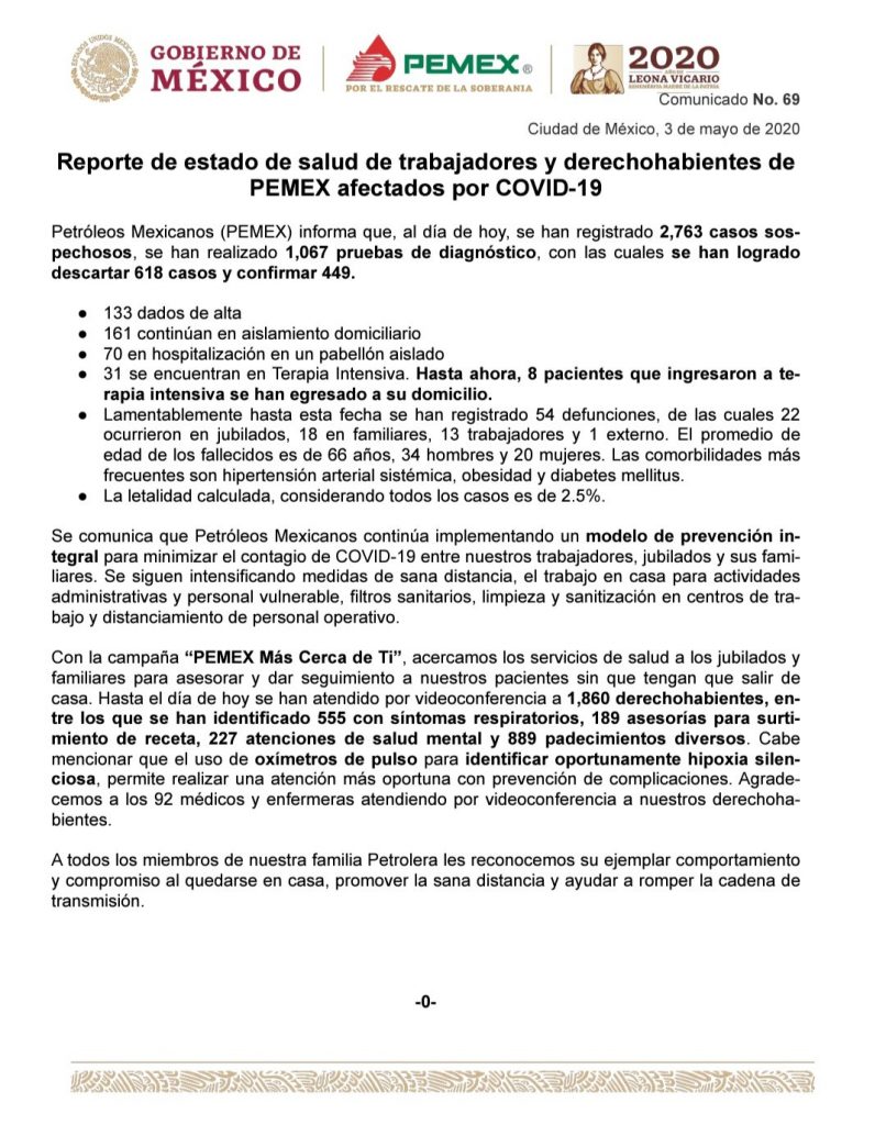 Ciudad de México a 03 de mayo de 2020.- La empresa Petróleos Mexicanos (Pemex) reportó que hasta este 3 de mayo se han registrado 54 defunciones por Covid-19 y se han confirmado 449 casos positivos en trabajadores y derechohabientes.