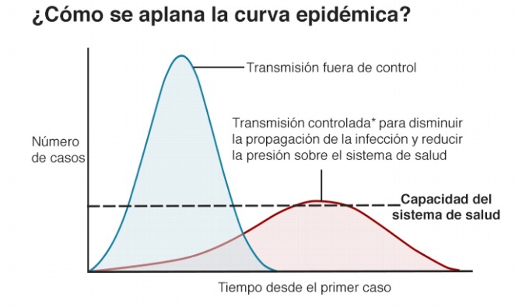 Es decir, para que el número de casos se distribuya en mayor tiempo (curva plana) y no experimentar un fuerte aumento de infecciones en un periodo corto (curva alta).