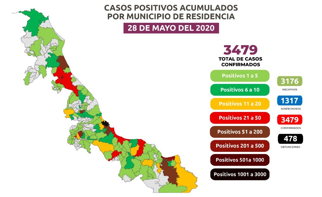 La cifra de positivos acumulados es de 3 mil 479 en 131 demarcaciones y 697 activos: Veracruz 1328, Coatzacoalcos 417, Poza Rica 315, Boca del Río 167, Minatitlán 149, Tuxpan 85, Córdoba 73, Medellín 56, Xalapa 55, Cosoleacaque 52, Papantla 47, Coatzintla 42, Orizaba 37, Tihuatlán 33, Alvarado 30, Cosamaloapan 27, Martínez de la Torre y Nanchital 22, Fortín y San Andrés Tuxtla 21, La Antigua 19, Las Choapas y Tierra Blanca 18, Agua Dulce 17, Perote 16, Jáltipan y Río Blanco 15, Santiago Tuxtla 14, Acayucan 13, Manlio Fabio Altamirano 12, Ixtaczoquitlán 11; Emiliano Zapata e Ixhuatlán del Sureste 10; Ángel R. Cabada, Misantla y Úrsulo Galván 9; Isla, Lerdo de Tejada y Pánuco 8; Amatlán de los Reyes, Ayahualulco, Cerro Azul, Coacoatzintla, Cuitláhuac, Pueblo Viejo, Soledad de Doblado y Tlalixcoyan 7; Álamo, Coatepec y Jamapa 6; Huatusco, José Azueta, Mariano Escobedo y Tlacotalpan 5; Carlos A. Carrillo, Cazones, Chacaltianguis, Gutiérrez Zamora, Paso de Ovejas, Paso del Macho, Playa Vicente, Puente Nacional, Tantoyuca y Tlapacoyan 4.