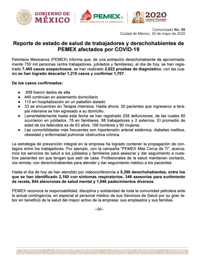 Ciudad de México ab30 de mayo de 2020.- La empresa Petróleos Mexicanos informó que registra 1,707 casos positivos de COVID-19 y 258 defunciones.