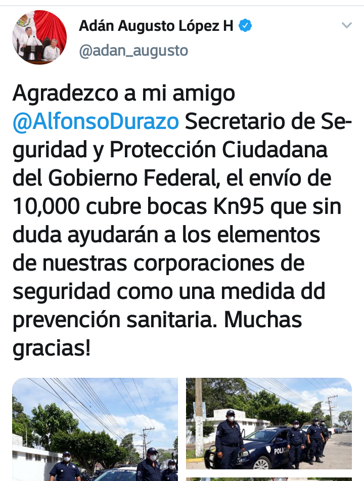 Y es que en su cuenta de redes sociales, el mandatario tabasqueño dio las gracias al funcionario federal por esta material de protección y prevención personal para los uniformados de la SSPC de la entidad en sus tareas operativas y rondines de vigilancia, ante la emergencia sanitaria generada por el COVID-19.