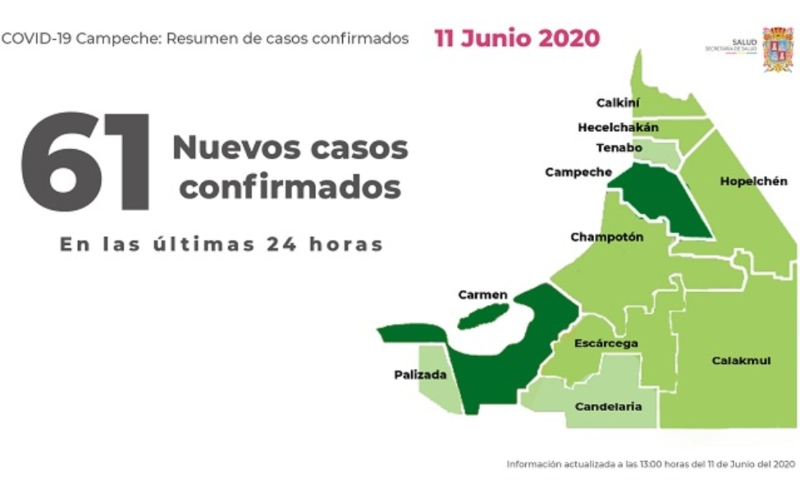 Precisó que los 61 casos positivos nuevos, se ubican: 26 de Carmen, 20 de Campeche, 12 de Escárcega, 2 de Champotón y 1 de Calkiní.