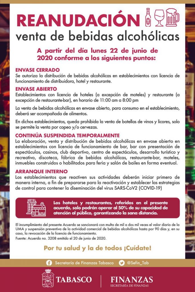 Villahermosa, Tabasco, 20 de junio de 2020.- La Secretaría de Finanzas publicó un acuerdo en el Periódico Oficial del Gobierno del Estado en el que anuncia que, a partir del próximo lunes 22, se autoriza la venta y consumo de bebidas alcohólicas en envase abierto en hoteles (con excepción de moteles) y restaurantes (con excepción de restaurante-bar), en un horario de 11:00 a 20:00 horas, de lunes a domingo.