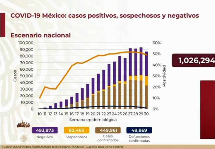 Ciudad de Mexico a 04 de agosto de 2020.- La Secretaría de Salud federal informó este martes 4 de agosto que, en el país se han registrado 48 mil 869 defunciones a causa de COVID-19.