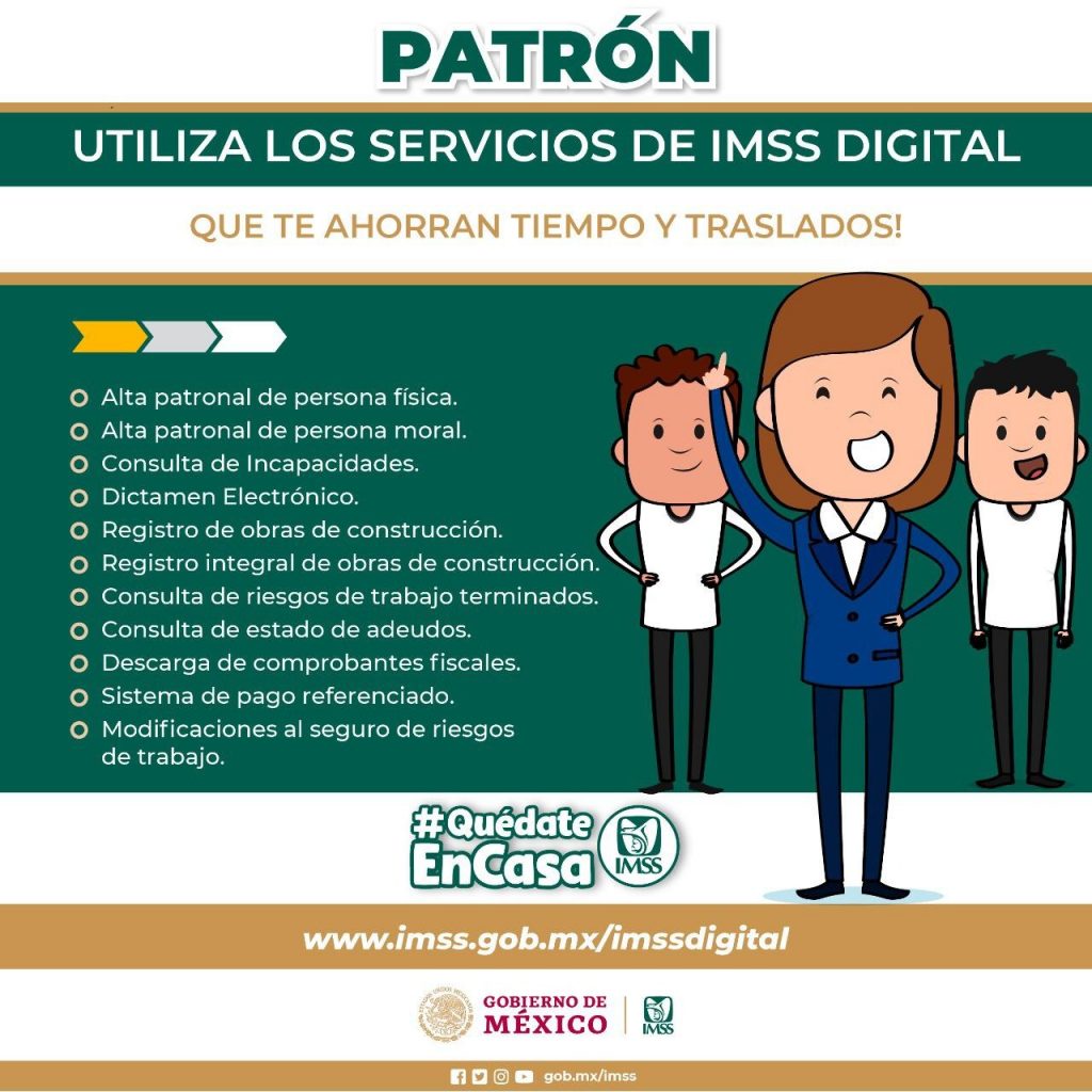 Finalmente, se reitera que los patrones pueden disponer de IMSS Digital para muchos otros trámites, como: alta patronal, tanto para personas físicas como morales; la consulta del dictamen electrónico; el trámite de incapacidades, de riesgos de trabajo terminados; los estados de adeudo; el registro de obras de construcción; la descarga de comprobantes fiscales y el sistema de pago referenciado.