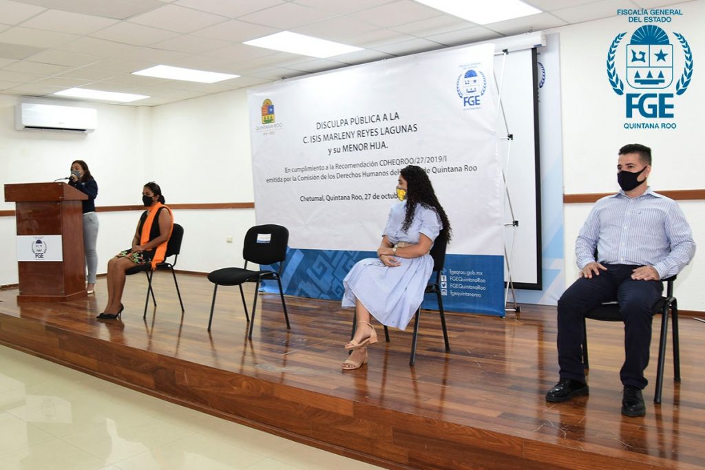 Chetumal, Quintana Roo a 27 de octubre de 2020. -La Fiscalía General del Estado de Quintana Roo informa que, en atención a la recomendación CDHEQROO/27/2019/I, emitida por la Comisión de Derechos Humanos del Estado, ofreció una disculpa pública y el reconocimiento de calidad de víctima a la ciudadana Isis Marleny Reyes Lagunas y su menor hija de identidad reservada.