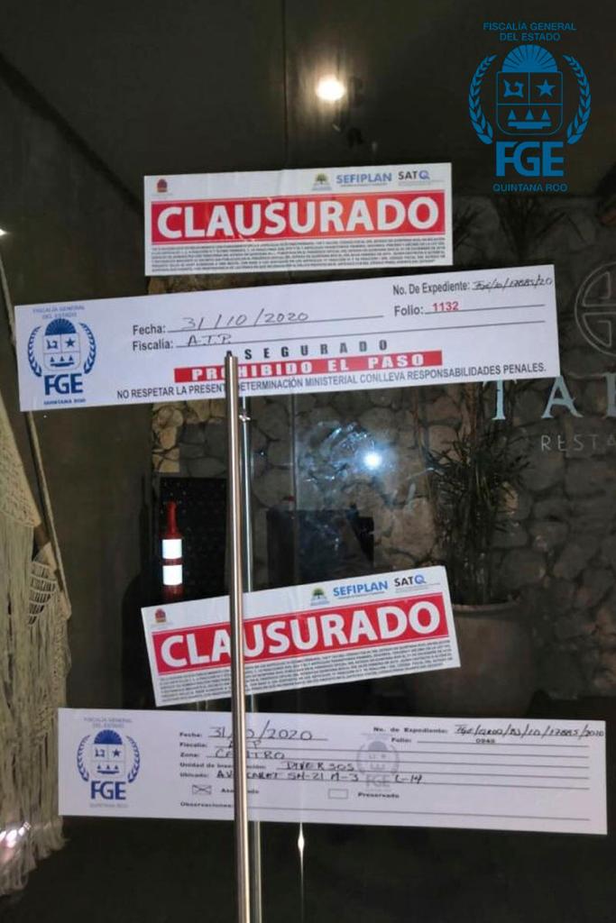 Cancún, Quintana Roo a 01 de noviembre de 2020.-La Fiscalía General del Estado de Quintana Roo informa que, este sábado 31 de octubre, policías de investigación adscritos a la Unidad de Delitos Diversos, aseguraron un restaurante ubicado sobre bulevar Kukulcán por la probable comisión de Delitos de Peligro para la Vida o la Salud de las Personas.