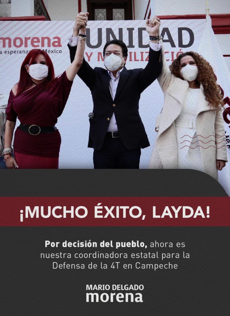“En un ejercicio democrático, transparente y en unidad, nuestra compañera @LaydaSansores resultó ganadora en la encuesta para el estado de #Campeche. Después de 90 años de un régimen de corrupción, el cambio llegará a esta entidad. #UnidadyMovilización ¡Felicidades!”, escribió.