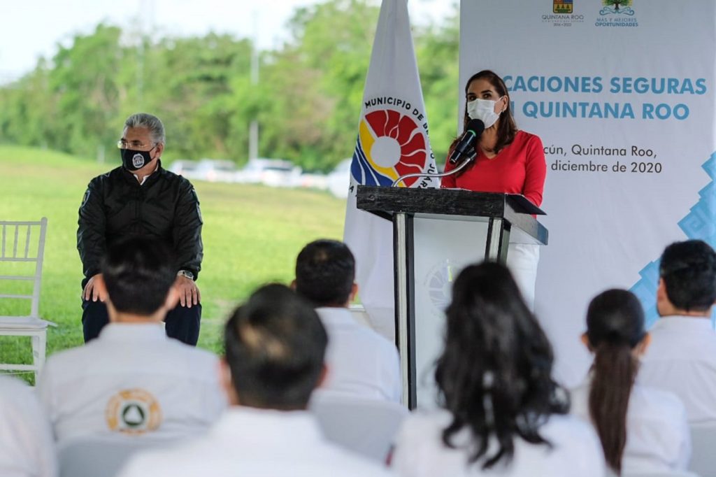Cancún, Quintana Roo, a 18 de diciembre del 2020.- Autoridades de los tres órdenes de gobierno así como instituciones en materia de seguridad y rescate dieron el banderazo de salida simbólico para el inicio del operativo “Vacaciones Seguras en Quintana Roo”, en el que participan todas las corporaciones con 513 unidades y cinco mil 312 elementos para garantizar la integridad de turistas y locales en este periodo vacacional.