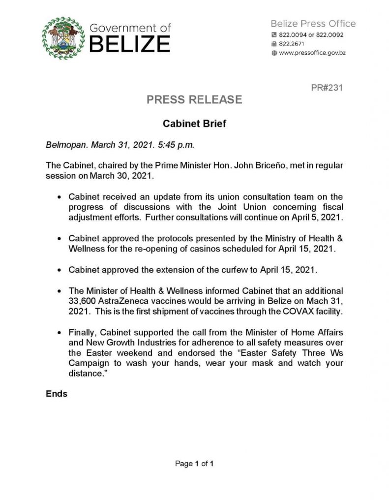 Así se aprobó en la sesión ordinaria de gabinete del gobierno de ese país presidida por el primer ministro John Briceño, después del visto bueno a los protocolos presentados por el Ministerio de Salud y Bienestar.