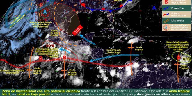 El establecimiento de una vaguada sobre la península de Yucatán, en combinación con el contenido de humedad en la región, generarán probabilidad para intervalos de chubascos con tormentas puntuales fuertes en Yucatan y Campeche, así como intervalos de chubascos con tormentas aisladas en Quintana Roo.