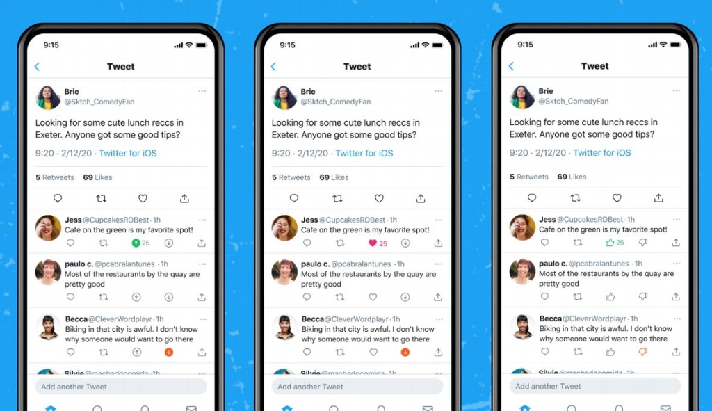 Este tipo de interacción cambiaría el ícono de corazón, indicado para dar likes a las publicaciones, por dos íconos nuevos indicados para votar positiva o negativamente cada trino. Entre las posibles opciones que se están probando están flechas hacia arriba y hacia abajo, manos con pulgares arriba y pulgares abajo, y hasta una combinación entre el corazón y una flecha hacia abajo para indicar disgusto.