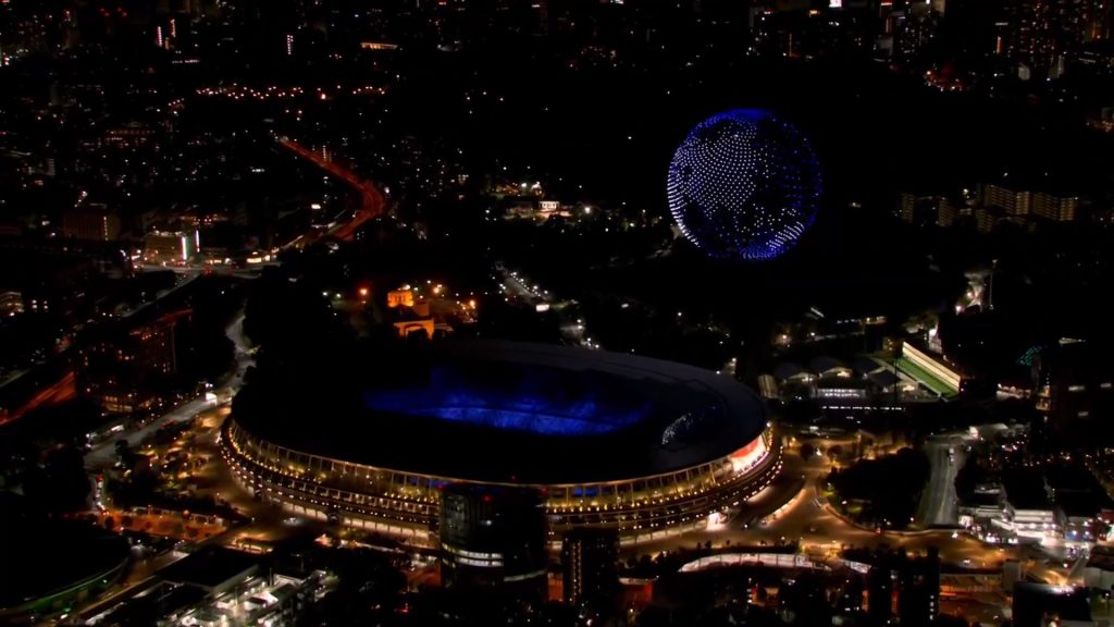 Fueron 1.824 drones que formaron desde el centro del Estadio Olímpico el emblema de los Juegos en color azul índigo, tonalidad tradicionalmente usada en el archipiélago japonés y se elevaron a la noche tokiota hasta formar un globo terráqueo al son de “Imagine”.