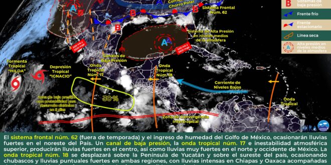 Se prevé que durante la mañana predominen condiciones de cielo despejado a parcialmente nublado, sin embargo hacia la tarde, el fuerte calentamiento diurno combinado con el ingreso de aire marítimo tropical asociado al paso de la onda tropical No.18, favorecerán el desarrollo de nublados vespertinos, con probabilidad para intervalos de chubascos con tormentas dispersas en sectores del centro y sur de Quintana Roo, mientras que para el centro, sur y noroeste de Yucatán, así como a lo largo del estado de Campeche, se esperan condiciones de chubascos con tormentas fuertes.