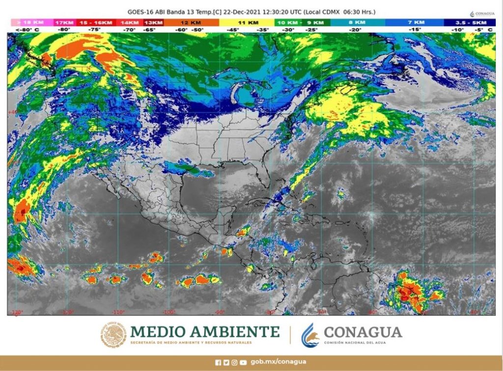 Ciudad de México a 22 de diciembre de 2021.-Este miércoles, la entrada de humedad del Océano Pacífico, el Golfo de México y el Mar Caribe, además de un sistema anticiclónico en niveles medios de la atmósfera, ocasionarán disminución de las lluvias sobre la mayor parte del territorio nacional, así como un gradual ascenso de las temperaturas diurnas, sin embargo, se mantendrá el ambiente de frío a muy frío con heladas matutinas en zonas del norte, centro y oriente de la República Mexicana.