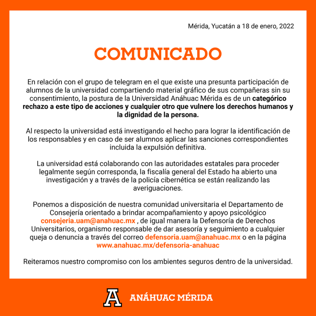 MÉRIDA, Yuc., 19 de enero 2022.- Un nuevo escándalo de violencia digital hacia las mujeres se ha dado a conocer este martes en diversas redes sociales, donde el colectivo Sororidad Anáhuac denunció la existencia de un chat en Telegram llamado “Zorritas de la UAM” en el que se comparten fotos y videos de las jóvenes sin su consentimiento.