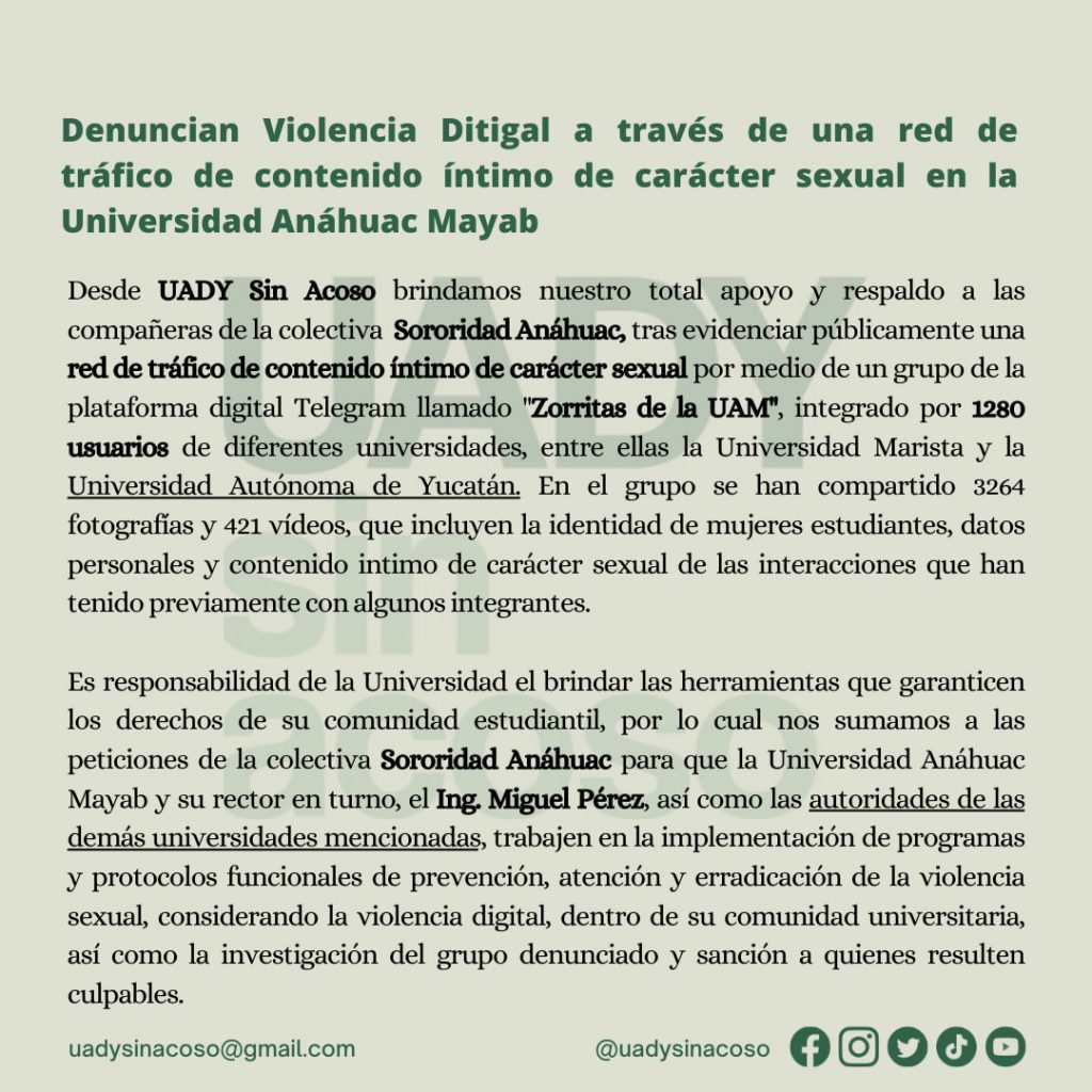 Diversos colectivos feministas y de alumnas ya se han pronunciado sobre este asunto y compartido comunicados en redes como UADY sin Acoso, donde pidieron que se investigue a fondo este hecho entre el estudiantado de la Universidad Anáhuac Mayab.