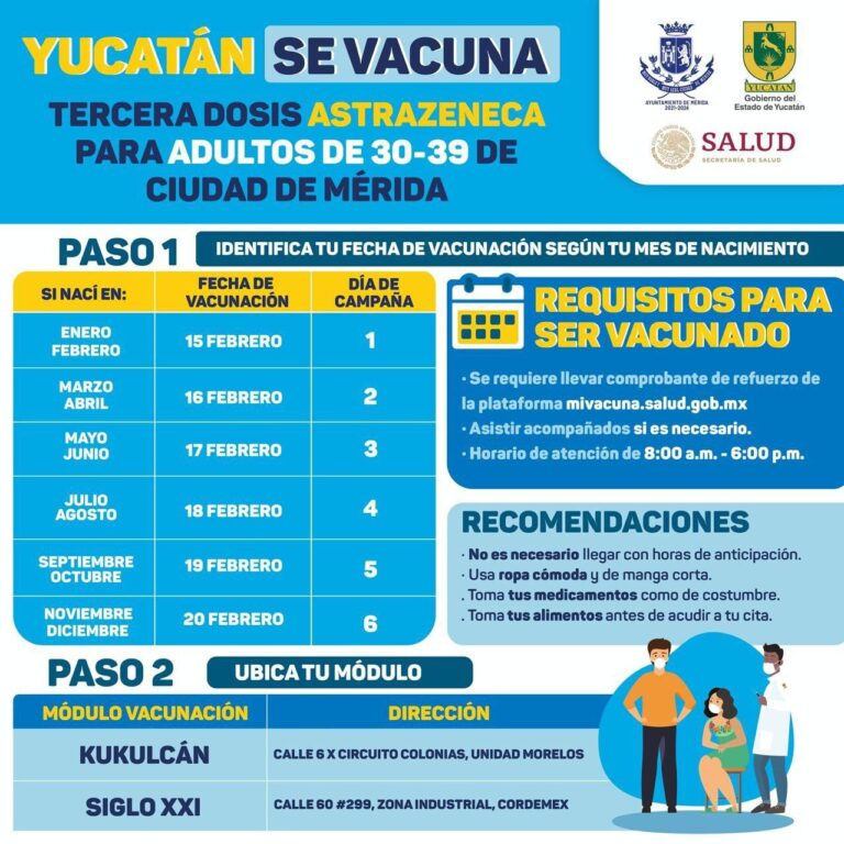 Mérida, Yucatán, 11 de febrero de 2022.-En Yucatán continúa avanzando en la campaña de vacunación para cuidar y mantener la salud de su población, por lo que del martes 15 al domingo 20 de febrero, se realizará la aplicación del refuerzo de la vacuna contra el Coronavirus a personas de 30 a 39 años de Mérida, informó la Secretaría de Salud del Estado (SSY).