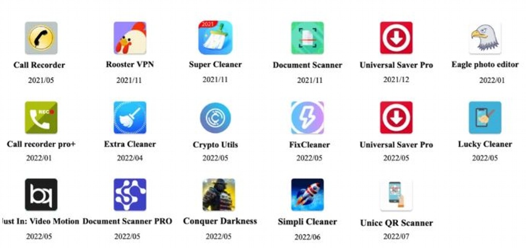 Las plataformas identificadas y que se deben eliminar son Just In: Video Motion, Document Scanner Pro, Conquer Darkness, Simpli Cleaner, Unicc QR Scanner, Call Recorder, Call Recorder pro +, Rooster VPN, Super Cleaner, Universal Saver Pro, Eagle photo edit, Extra Cleaner, Crypto Utils, FixCleaner, Lucky Cleaner.(Fuente: Infobae)