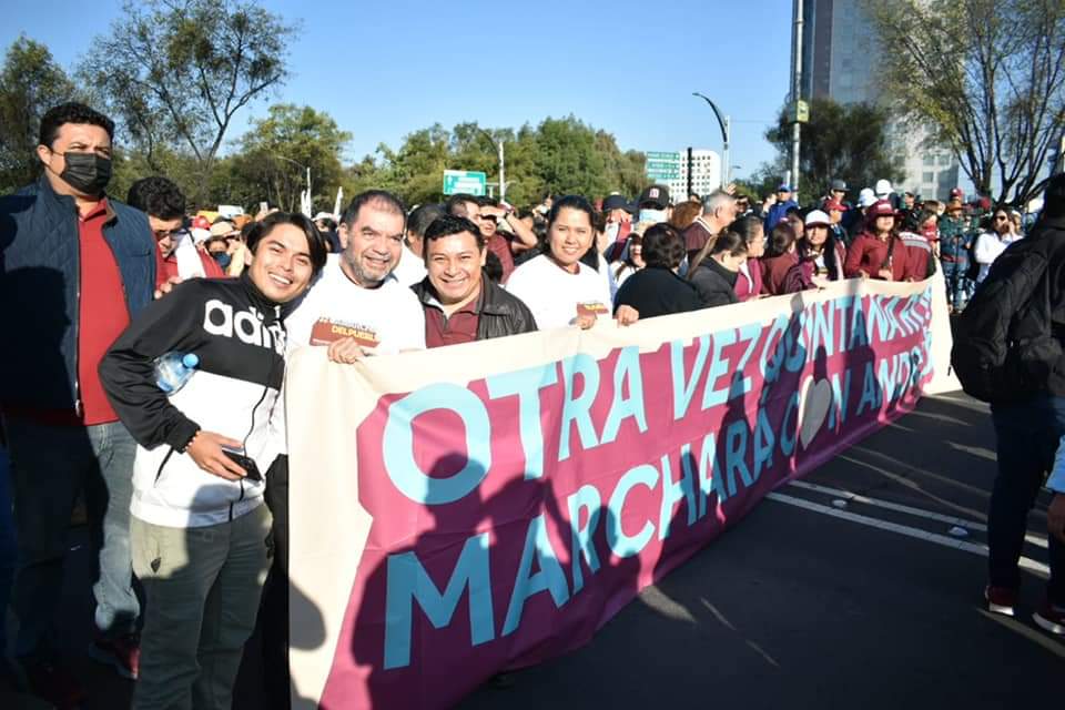 Aco.pañadpa de pancartas y mantas que expresan su apoyo al presidente Andrés Manuel López Obrador, contingentes procedentes de los 11 municipios de la entidad viajaron en autobús desde el fin de semana para hacerse presente en el multitudinario mitin realizado este domingo en avenida Reforma de la capital del país.