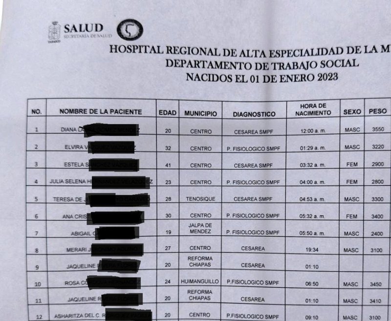Villahermosa, Tabasco 01 de enero 2023.-Hasta el corte de las 9 de la mañana, el Hospital Regional de la Mujer, reportó el nacimiento de 12 menores en las primeras horas de este 2023 de los cuales 8 fueron masculinos, 3 femeninos y uno que no se especifica en el listado.