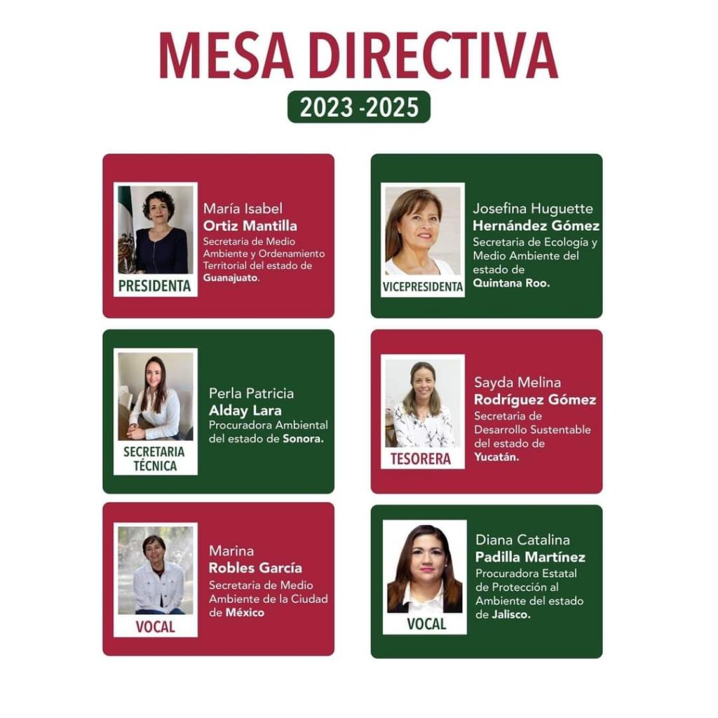 Cabe destacar que es la primera vez en 20 años que la Mesa Directiva está conformada por mujeres: la Presidencia es asumida por María Isabel Ortiz Mantilla, secretaria de Medio Ambiente y Ordenamiento Territorial de Guanajuato; como secretaria técnica, la titular de la Procuraduría Ambiental de Sonora, Perla Patricia Alday Lara; como Tesorera, Sayda Melina Rodríguez Gómez Secretaría de Desarrollo Urbano y Medio Ambiente de Yucatán, y como vocales fungirán Marina Robles García Secretaria de Medio Ambiente de la Ciudad de México y Diana Catalina Padilla Martínez Procuradora Estatal de Protección al Ambiente de Jalisco.