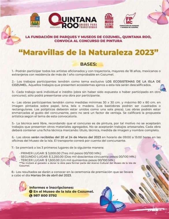 Cozumel, Quintana Roo 18 de febrero 2023.- Para celebrar los 36 años del Museo de la Isla, la Fundación de Parques y Museos de la Isla (FPMC) invita a pintoras y pintores plásticos aficionados y con trayectoria, mayores de 18 años de edad, que vivan en la Isla a participar en el Concurso de Pintura “Maravillas de la Naturaleza”.