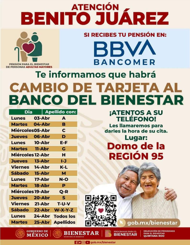 Cancún, Quintana Roo, 04 de abril 2023.- Desde el pasado 3 de abril, hasta el próximo 25 de abril, en Cancún la Secretaría del Bienestar, por parte del Gobierno de México, estará entregando las Tarjetas del Bienestar a los derechohabientes del Programa de Pensión de Adultos Mayores.