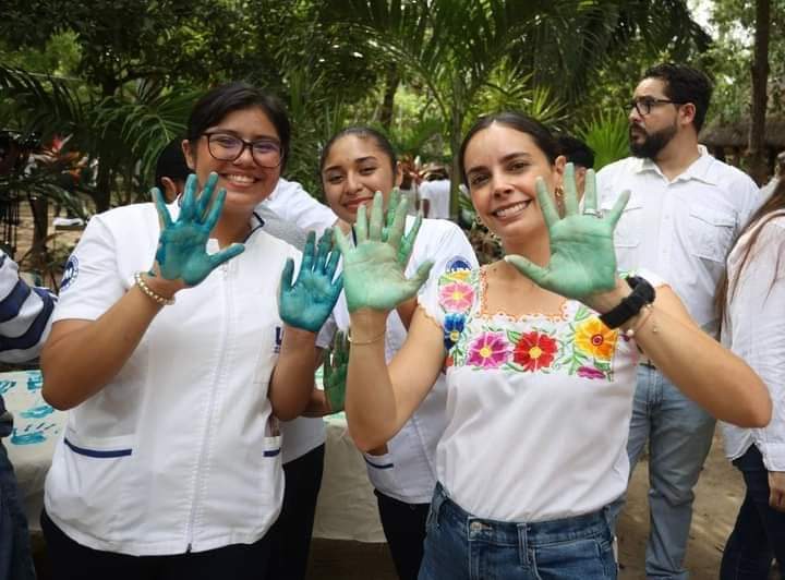 Cancún QuintanaRoo., 06 de junio de 2023.- “Pon tu granito de arena en favor del medio ambiente. Amemos nuestro planeta”, escribió con puño y letra la Presidenta Municipal, Ana Paty Peralta, a un lado de las huellas de las palmas de sus manos en color verde que plasmó con pintura junto con varios estudiantes en una manta con frases positivas, como parte de las actividades de la IV Feria Ambiental en el Parque Ecológico Kabah, con motivo de la conmemoración del Día Mundial del Medio Ambiente.
