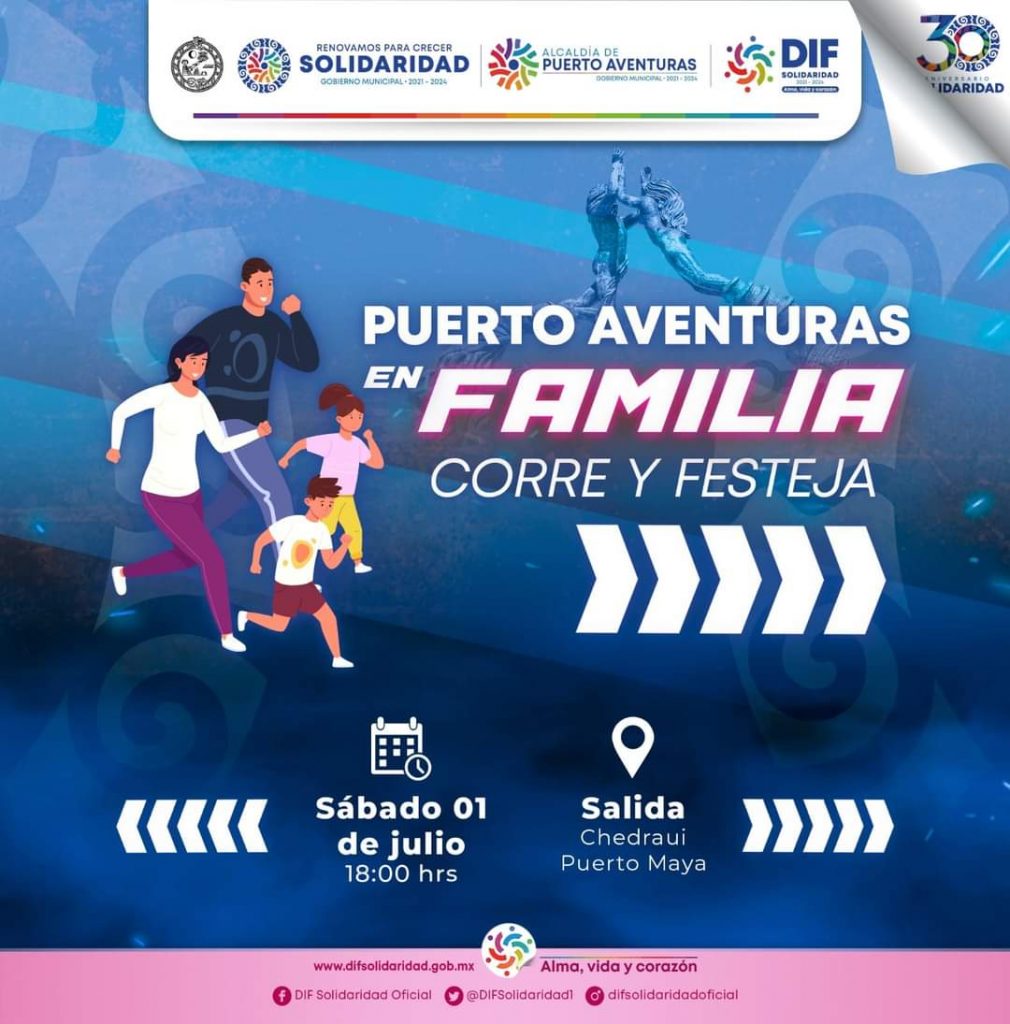 Playa del Carmen, Solidaridad Quintana Roo 22 de junio 2023.- En el marco del 30 aniversario del municipio, el Gobierno de Solidaridad que encabeza la presidenta Lili Campos , a través del DIF llevará a cabo la carrera “Puerto Aventuras en familia corre y festeja”, el próximo sábado 1 de julio, a las 18:00 horas.