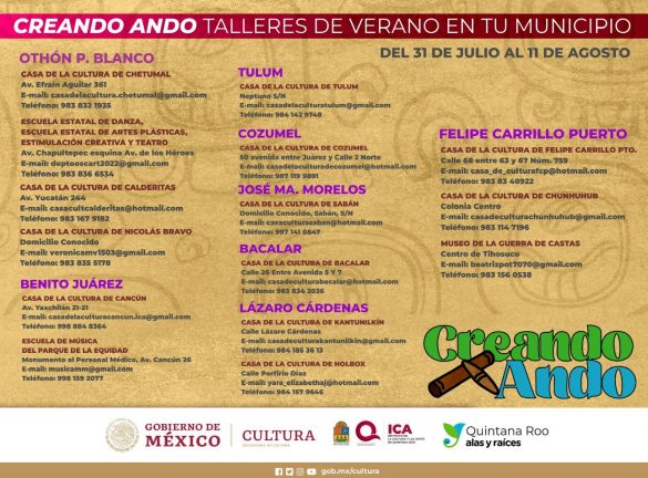 Los que deseen participar podrán solicitar información sobre los cursos de verano del ICA al teléfono: 983-83-66534 y/o al correo electrónico deptoescart2022@gmail.com y redes sociales @culturadeqroo, donde será publicada la información por municipio.