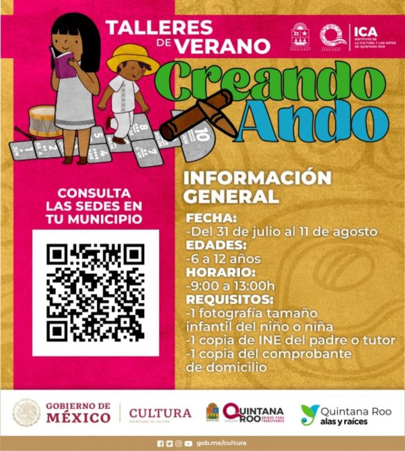 Chetumal, Quintana Roo 20 de julio 2023.- Para que la niñez cuente con espacios de paz, seguridad y desarrollo social durante este periodo vacacional, el Instituto de la Cultura y las Artes (ICA) invita a las niñas y niños a participar en los cursos artísticos de verano que se realizarán del 31 de julio al 11 de agosto en las casas de cultura, las escuelas de arte y la biblioteca pública “Javier Rojo Gómez”.