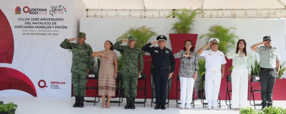 Chetumal, Quintana Roo, a 30 de septiembre del 2023.- Con la conmemoración del 258 aniversario del natalicio de José María Morelos y Pavón, uno de los principales insurgentes, finalizaron los eventos cívicos que el Gobierno de Quintana Roo realizó en Chetumal durante el mes de Septiembre para conmemorar el 213 Aniversario del inicio de la lucha por la Independencia de México. En las actividades también participaron las Fuerzas Armadas y el Ayuntamiento de Othón P. Blanco.