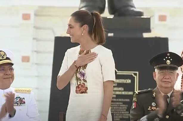 Y es que en la ceremonia la acompañan la gobernadora Rocío Nahle, mandos de Marina, Sedena, del Congreso de la Unión, de la Suprema Corte y miembros del gabinete federal.