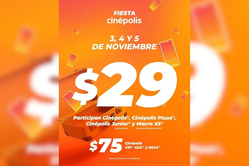 Ciudad de México, 22 de octubre de 2025.-La cadena de cines Cinépolis anunció que durante los días 3, 4 y 5 de noviembre de 2025 realizará su promoción anual “Fiesta Cinépolis”, en la cual los boletos para salas tradicionales tendrán un precio especial de $29 pesos. En los formatos premium, como salas VIP, IMAX o 4DX, el precio también se reduce significativamente a $75 pesos por boleto.
