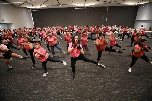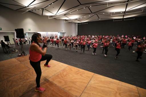 El salón Uxmal 1 se llenó de energía, música y entusiasmo, con la participación de mujeres y hombres que, vestidos de rosa y con calzado deportivo, se sumaron a esta jornada de prevención y solidaridad. Bajo la instrucción de Fanny Canul, las y los asistentes disfrutaron de una rutina dinámica que combinó movimiento, ritmo y mensajes de autocuidado.