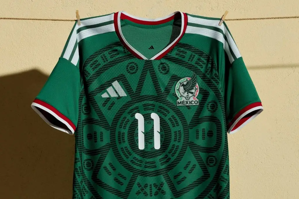 En el jersey de México predomina el color verde junto con un diseño similar al de ‘La Piedra del Sol’ abarcando toda la superficie, como la que se utilizó en 1998, y también cuenta con vivos blancos y rojos, además de las características tres rayas de Adidas.