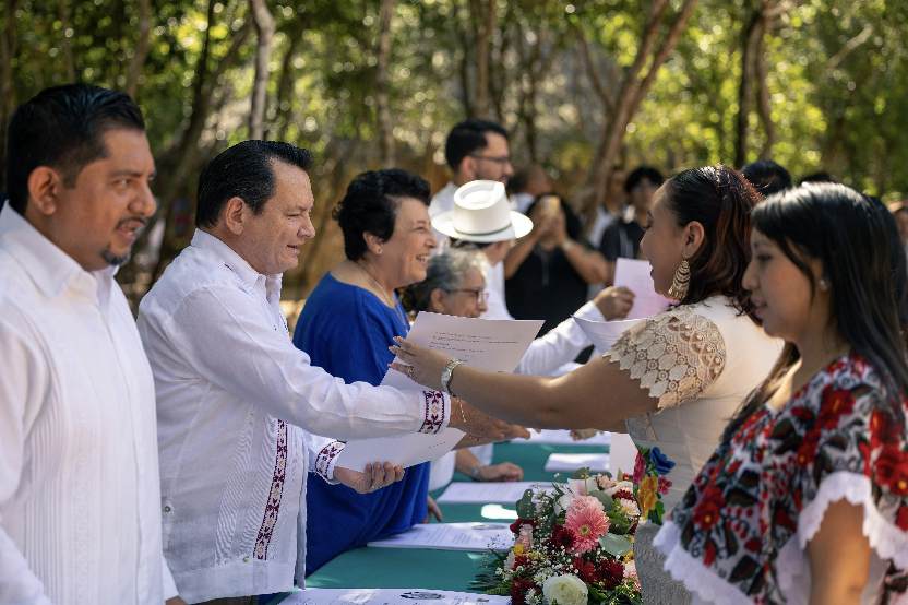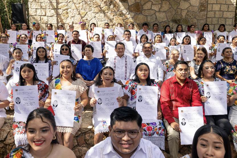 Valladolid, Yucatán, a 14 de noviembre de 2025.-El Gobernador Joaquín Díaz Mena encabezó la entrega de 220 certificados de licenciatura a egresadas y egresados de las Universidades para el Bienestar Benito Juárez García (Ubbjg), quienes concluyeron sus estudios en las carreras de Educación Docente en Educación Básica y Patrimonio Histórico y Cultural de México.