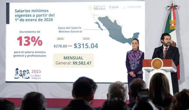 Ciudad de México 03 de diciembre de 2025.-La Presidenta de México, Claudia Sheinbaum Pardo, anunció que, en acuerdo con el sector obrero y patronal, y en beneficio de 8.5 millones de personas trabajadoras, el salario mínimo general tendrá un incremento del 13 por ciento a partir del 1 de enero de 2026: de 315.04 pesos diarios a nivel general, lo que representa 9 mil 582.47 pesos mensuales y de 5 por ciento en la Zona Libre de la Frontera Norte (ZLFN) para quedar en 440.87 pesos diarios y en 13 mil 409.80 pesos mensuales.