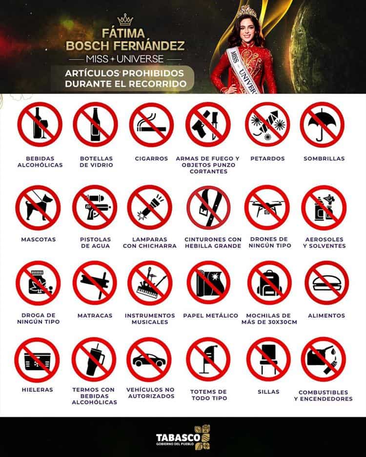 Villahermosa Tabasco 12 de diciembre de 2025.-El gobierno del Estado difundió una lista de artículos prohibidos durante el recorrido de la Miss Universo 2025, Fátima Bosch, programado para el próximo domingo 14 diciembre en las calles de Villahermosa.