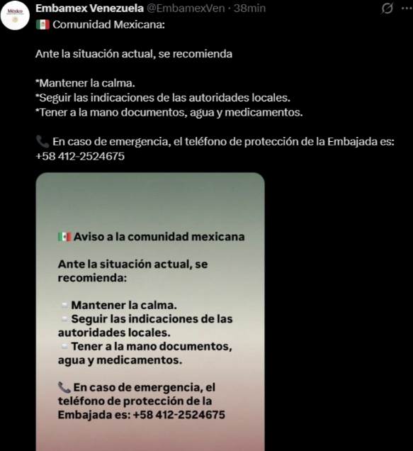 Caracas, Venezuela. 03 enero 2026.-La Embajada de México en Venezuela pidió a los connacionales que se encuentran en territorio venezolano mantener la calma ante el bombardeo registrado la madrugada de este sábado 3 de enero.