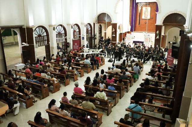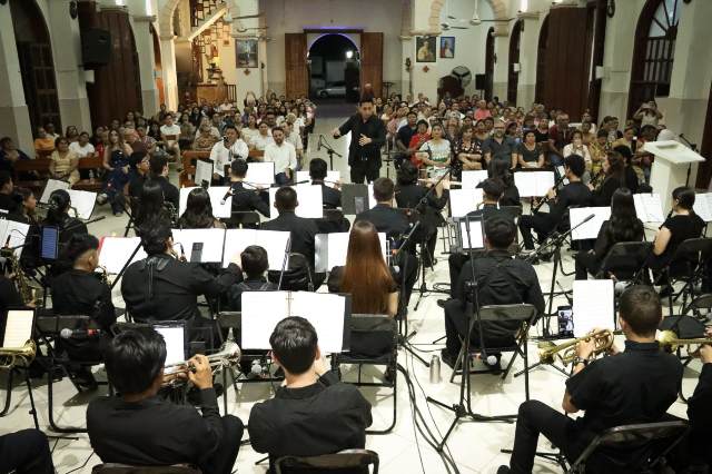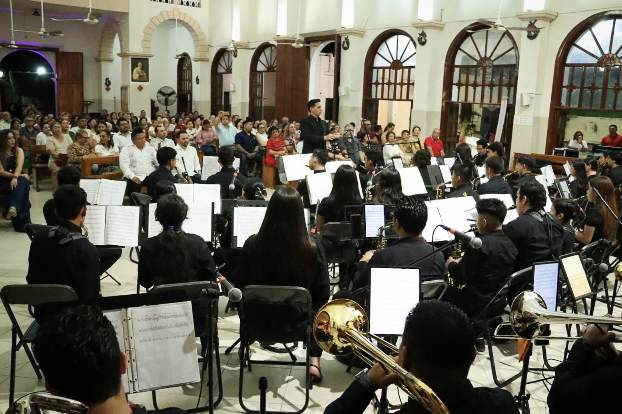 Tizimín, Yucatán, a 14 de marzo de 2026.-Bajo las bóvedas de la parroquia de Nuestra Señora de Guadalupe, el silencio de la noche se transformó en música. La Banda Sinfónica Infantil y Juvenil de Tizimín inauguró su ciclo de conciertos 2026 con «De vuelta a lo clásico», como parte del programa Paaxil Kuxtal: Música para la Vida, que impulsa la Sedeculta, que lleva educación musical al interior del estado.
